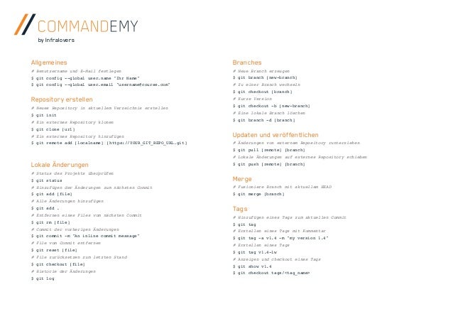 Git cheat sheet deutsch pdf. Git cheat sheet create from existing repo from existing data cd projects myproject git init git add. I hope you found our git advanced commands cheat sheet useful and i d love to hear your git tips and tricks or your favorite git commands. Options include new staged and modified files. On the front you can find all important commands.